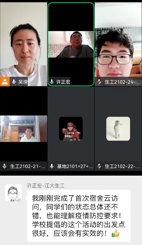 生工2102班张益豪同学说,“我们宿舍与许院长进行了一次‘面对面’的云上交流,他询问大家疫情防控期间的生活学习情况,分享自己的经历鼓励大家,对专业学习进行了指导,建议大家多交流沟通,互帮互助,共同进步。在与许老师的交谈中,我们感受到他的和蔼可亲、平易近人,对同学们的关心关爱,以及学院对同学们的重视与关注,令人温暖、愉悦。”