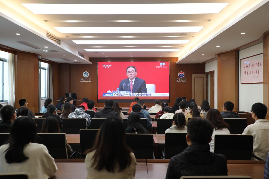 11月12日上午,best365网页版登录官方网站组织师生党员代表在茅台厅收看了关于党的十九届六中全会新闻发布会直播,学院党委书记王维、院长许正宏,院领导周云龙、聂尧、陈献忠等参加了学习。