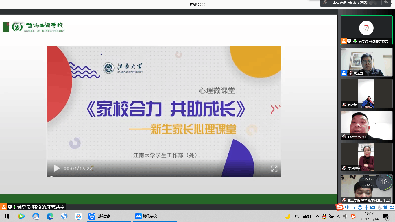 会议伊始,家长们共同观看了best365网页版登录官方网站心理健康教育中心制作的家长心理课堂。该课堂让新生家长们认识到同学们已经进入人生发展新阶段,了解到大学与高中的区别,以及面对新的学习生活,家长们可以做些什么。随后,周云龙代表学院欢迎各位家长,并介绍best365网页版登录官方网站校情校史。接着,周云龙聚焦学院历史沿革与学科底蕴,围绕学院师资队伍、科学研究、文化传承与创新等方面,从学院近年来毕业生升学和就业去向分享了学院人才培养成效。最后,周云龙从重视学生心理健康教育出发,与家长们分享了学生发展的宝贵经验:引导树立积极乐观的心态;学会感恩和宽容;提高直面挫折的勇气;教会孩子学会自我保护,提高安全意识;鼓励孩子敢于梦想;培养孩子良好的沟通技巧与合作能力;引导形成正确的钱财观;帮助学生正确认识自我,塑造完整人格,实现全面发展。最后,学院新生辅导员韩俊就学校疫情防控举措、学业课程安排和学生管理服务三个方面,传达了学院师生高度重视新生转型教育的理念与举措,向家长们介绍了同学们近期的状态和学院特色活动,让家长放心。同时对家长们提出三点建议:希望家长们关注学生在校状态,与孩子交流;肯定学生在校独立生活和适应集体生活的能力;提高防诈骗的安全意识,及时实现家校沟通。