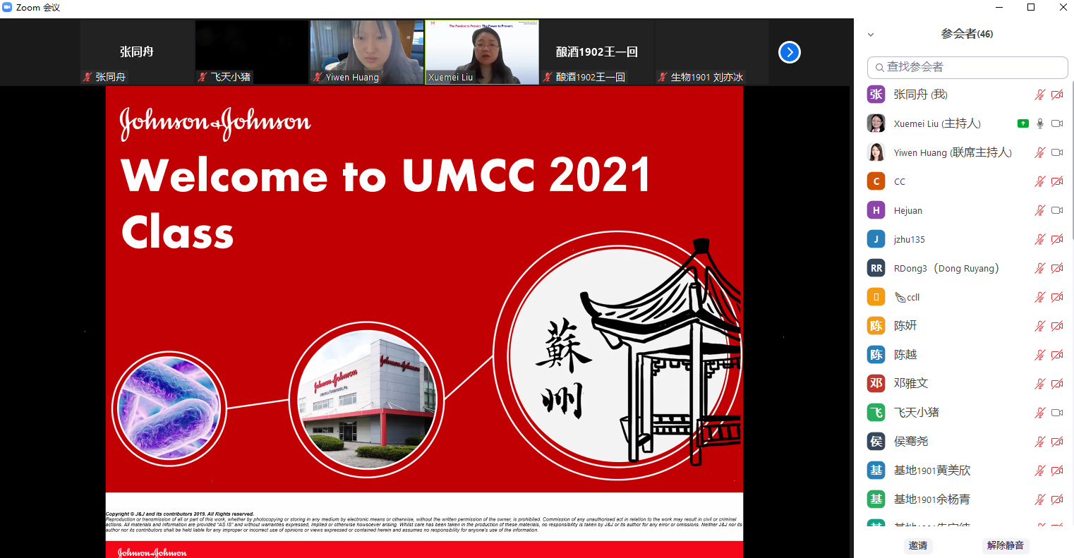 11月27日下午,best365网页版登录官方网站与强生(苏州)医疗器材有限公司2021年度校企合作课程(医疗器械和制药微生物学UMCC模块)开班并进行第一次授课。强生(苏州)公司微生物质量及无菌保证(MQSA)总监刘雪美、MQSA高级研究员黄奕雯、MQSA经理朱健杰、MQSA研究员董薷阳,best365网页版登录官方网站辅导员张同舟等参加活动。因疫情防控需要,本次课程通过ZOOM平台线上举行。