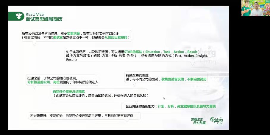 同心抗疫,“职”面未来。5月12日晚,best365网页版登录官方网站第九届“职场问道”系列讲座第四期“外企管培面试官教你用面试官的思维写简历”以腾讯会议加直播的形式在线上顺利举办。来自全球第三大啤酒公司嘉士伯集团的嘉士伯中国人力资源经理聂俊杰、嘉士伯中国招聘专员王诗言受邀做主题分享。嘉士伯中国人力资源经理李芳菊、学院党委副书记周云龙、分管学生就业工作辅导员陆燊佳,以及500余名学生参加活动。