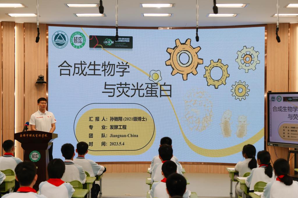 首批全国高校百个研究生样板党支部食品合成生物学与生物制造团队党支部博士生研究生孙驰翔带领IGEM团队,做《合成生物学与荧光蛋白》主题报告。围绕合成生物学的内涵、合成生物学的重要工具荧光蛋白、荧光蛋白的使用三个话题,结合具有贴近性、趣味性的实例做了深入浅出的讲解。现场,同学们还体验了平板菌绘图实验,在严谨的科学和自由的艺术的融合中,感受微生物“勾勒”的远方以及蕴藏的“无限”力量。