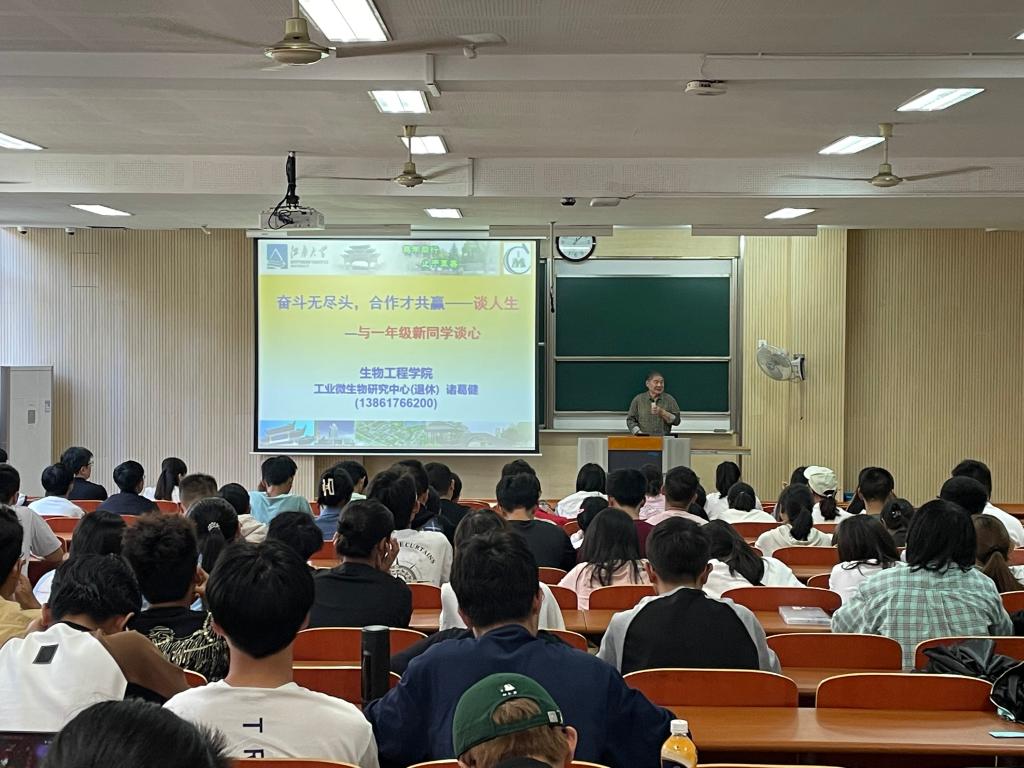 诸葛老师以风趣的语言和幽默的风格为同学们带来了一场生动的励学讲座。他以“即使老年了也要继续发挥余热”的信念表达了对教育事业的热爱、对莘莘学子的期待。最后,诸葛老师寄语全体新生:“国家的希望寄托在你们身上!努力吧!年轻人!”期盼新一代生工学子能够习得一流本领,发挥一流精神,再续生工一流辉煌。
