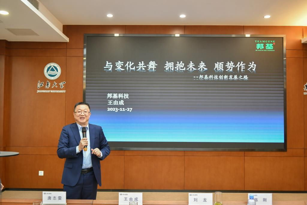 王由成结合自身创业求职感想,带来《与变化共舞,拥抱未来,顺势而为——谈邦基创新发展之路》主题报告。他从家文化管理、两个中心经营、三大逻辑运营、四“0”经营管理、五好品质团队、六好特质企业管理、七个好习惯管理、八大理念管理、九个产品营销、十大全员意识等十个维度解读了邦基十大管理模式,强调了企业需要秉持以不变应万变的逻辑与变化共舞,顺势而为。他还介绍了邦基独有的邦基教育与邦基大学堂,从传授思想、文化、理论、认知、理念、模式等角度为行业的健康、稳健、可持续发展贡献力量。王由成向同学们介绍了邦基发展历程,并以此勉励大家在学习、科研、求职的人生之路上坚定理想信念、重视理论实践相统一、把握时代变化规律、重视理念认知的素养提升。