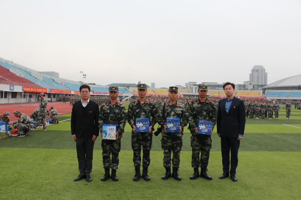 休息时间开始,同学们按班级顺序排队领取慰问品,同时学院领导悉心询问同学们的训练情况,对同学们的身体状态表示了关心。在慰问同学们的同时,老师们也为军训期间艰苦付出的教官们准备了慰问品,感谢教官对同学们的照顾与关怀。