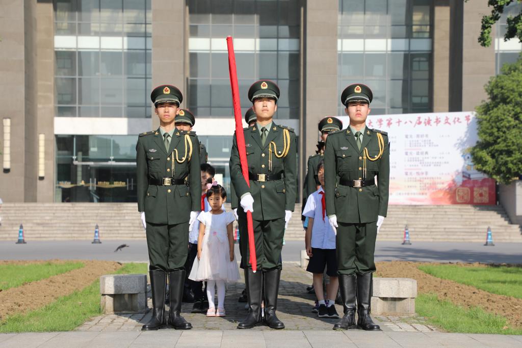 活动开始,在《中国少年先锋队队歌》的歌声中,小朋友们向家长们敬献红领巾,一个个熟悉的动作,体现的是爱与责任的传承。随后,国旗班的大学生们带领小朋友,大手拉着小手,共同组建护旗方阵,昂首阔步,护卫国旗走至旗杆下。伴随着雄壮的《义勇军进行曲》,小学生升旗手与国旗班大学生升旗手共同将五星红旗升至旗杆顶端,成功完成护旗、升旗任务,爱国主义情感充盈活动现场,仪式感满满!