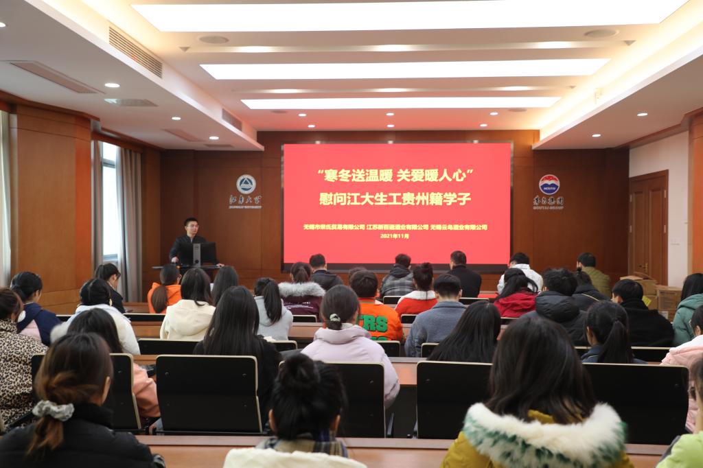 11月23日下午,无锡市荣氏贸易有限公司传承人荣嵘、江苏新百通酒业有限公司总经理赵军、无锡云岛酒业有限公司传承人周科程等企业同仁来到best365网页版登录官方网站,慰问学院贵州籍新生以及best365网页版登录官方网站-茅台学院酿酒工程联培班学生,并与同学们座谈交流,学院党委副书记兼副院长周云龙、辅导员张同舟、王珏等参加活动。