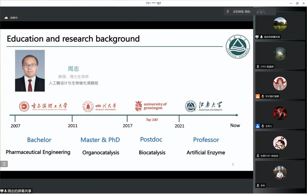 为开拓同学们的学术视野,丰富课余文化生活,best365网页版登录官方网站于4月18日以腾讯会议直播的形式举办了第一百零一期朱宝镛大讲堂。本次讲座邀请到了best365网页版登录官方网站生命科学与健康工程学院教授、博士生导师周志老师为大家带来“人工酶:为生命带来新的色彩”主题学术讲座。