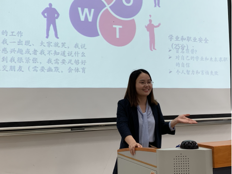 报告开始前,徐静雯老师通过手指曼波的热身活动,把现场氛围调动起来。随后,徐老师结合自身的求学经历,以及哈佛助理教授、伊拉克士兵等例子,并结合国家幸福研究报告数据,提出了为什么要自我关怀以及如何自我关怀的问题。一个人的幸福感可以从身体、心理、财产、学业四个维度去衡量,徐老师结合新生入学的特点,用自己求学时候的故事向大家阐述了自我关怀的重要性,“它是同学攻克难关的强大支撑”。最后徐老师向大家介绍了各种常见心理问题的应对方法,鼓励大家要对自己充满善意,接纳自己的负面情绪和感受,理解不完美是人性的共同点,在生活中要常练习正念等,为研究生即将攀登科研高峰提供了基石。