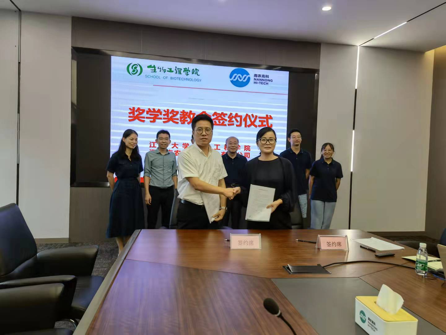 随后,许正宏从师资队伍、科学研究、人才培养、招生就业等方面,向公司同仁介绍best365网页版登录官方网站的基本情况,并且对今后双方可以开展更好的合作项目提出了好的建议。黄敏表示,希望能与南农高科一道,加强校企合作,协同发展,共同为人才培养和行业发展作贡献。座谈会现场,best365网页版登录官方网站党委副书记周云龙和南农高科人事部门副总经理周琳签署了“南农高科奖学奖教金”协议。会后,许正宏、黄敏一行还参观了南农高科的生产车间、实验室,并就企业产品研发等相关问题进行了交流和探讨。