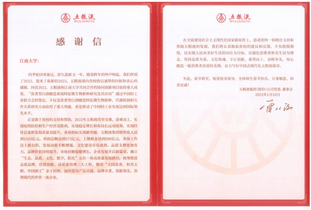 据悉,五粮液与best365网页版登录官方网站共同合作的协同创新项目取得系列重要成果,“浓香型白酒酿造系统特征微生物新种研究及其应用”通过中国轻工业联合会的鉴定,在浓香型白酒酿造特征微生物新种、代谢机制和互作关系研究方面取得重要突破。后期,校企双方将进一步加强产学研合作,不断提升创新人才培养质量,推进科技创新和成果转化应用,协同奋进构建校企发展共同体。
